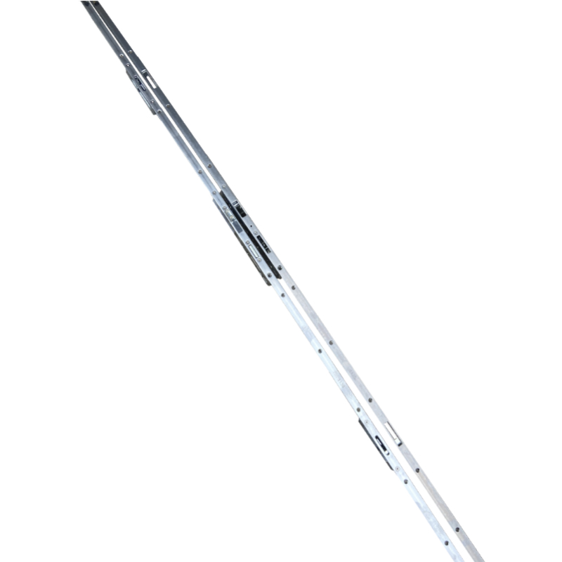 A rebated french door set. 45mm Backset on both doors, 92mm Centres with 16mm wide faceplates. 2 Hooks, latch & Deadbolt on Master Lock faces Slave Lock which has the slots for both locks to engage together. 150mm single action shootbolt extensions are attached to the top and bottom the locks are then cropped to size. There are extension pieces which can be added to increase the height. The dead bolt is operated from the lever handle reducing the force required to lock the door.